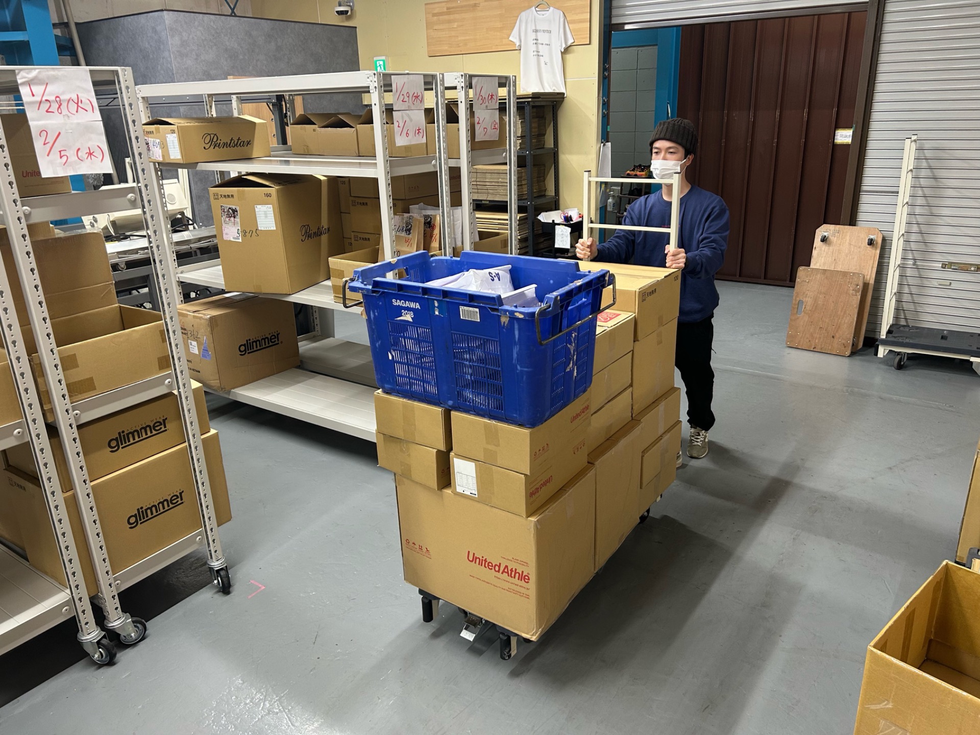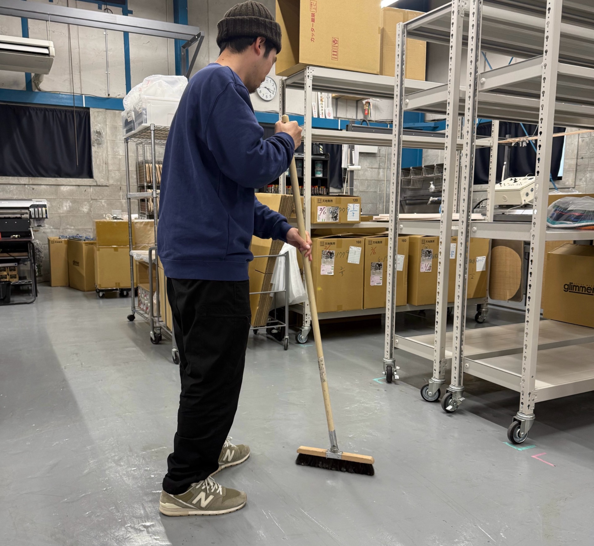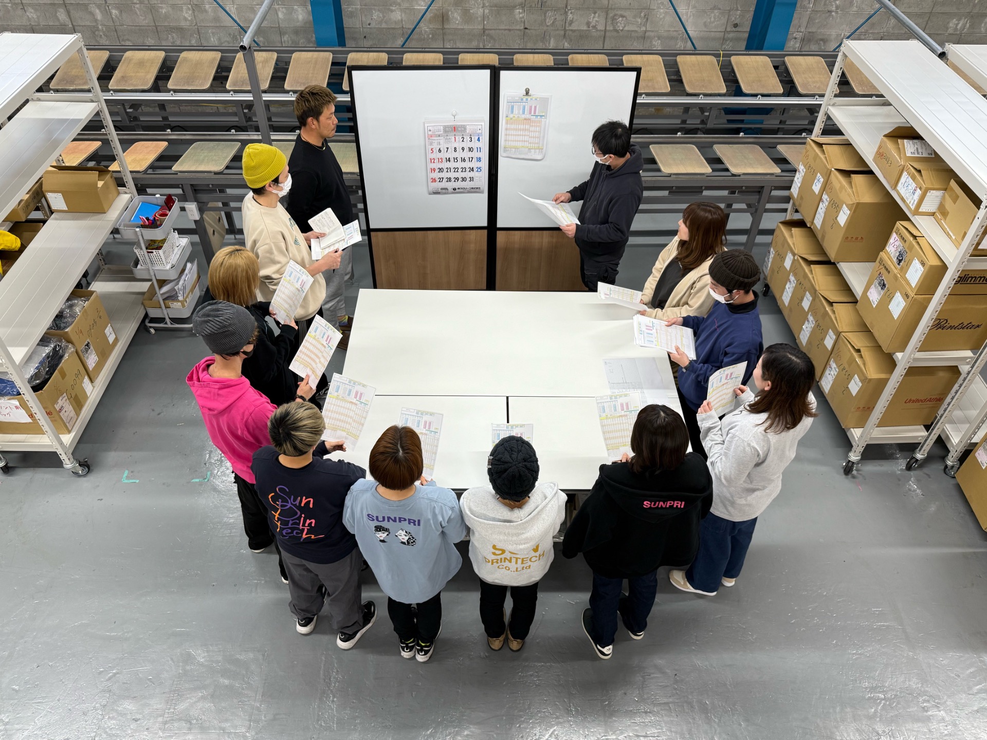サンプリの一日の流れ 一日の流れ こちらでは当社の一日の流れと、取り組みについてご紹介します。 9:00 朝礼 昨日の加工・出力などの実績、本日と翌日の加工・出荷予定数、加工不良の報告、その他連絡事項の報告を行います。 加工不良やミスが起きた場合は全員に共有し、同じミスが起こることを防ぐとともに、解決策を話し合い今後の改善に繋げています。 9:15 掃除 毎日掃除の時間が設けられており、各自決められた担当エリアの掃除を行います。 備品が決められた場所に必要数揃っているか等も確認します。 9:30 業務開始 工場全体の加工件数・出荷件数が分かるように工程表が公開されており、当日自分が何の業務をどれだけ行わなければならないか、一目でわかるようになっています。 それを元に一日の計画を立てながら業務を進めます。 入荷担当 検品担当 受注・製版担当 出力担当 加工担当 12:00 昼休憩 (60分) お弁当を持ってくる人、近くにコンビニや飲食店も多いので外食する人など、各々自由に過ごします。 13:00 業務再開 任意の時間に取得可能 小休憩 (10分) 各自、業務のキリがよいところで小休憩を取ります。 リフレッシュして再び業務にあたります。 16:30 配送業者に品物の引き渡し 納品日に確実にお客様のもとへお届けできるよう、スタッフ全員で協力しあいながら、出荷作業を行い、品物を引き渡します。 18:00 業務終了・退勤 機械のメンテナンスや片付け、一日を振り返る実績表などを記入し、業務が終了します。 (閑散期と繁忙期で、終業時間は変動する場合があります。)